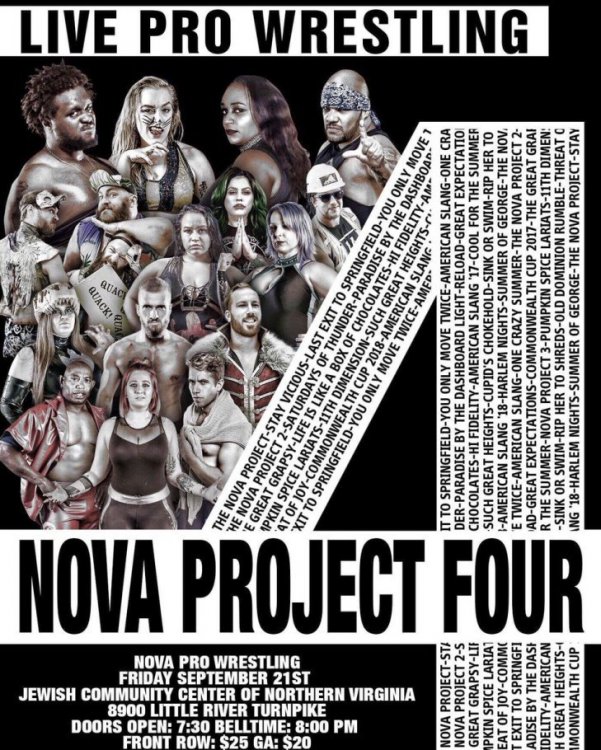 NOVA Pro NOVA Project 4 on Powerbomb.tv September 21, 2018 Fairfax, VA No review yet. 2 Cold Scorpio vs Arik Royal LuFisto vs Faye Jackson Crab Wrestling Title: Isaiah Frazier (c) vs Josh Fuller vs Mack Buckler AIW Intense Title: Tim Donst (c) vs Breaux Keller Ducks, Ladders and Chairs Match: Ugly Ducklings (Lance Lude & Rob Killjoy) vs Hooligans (Devin Cutter & Mason Cutter) Scramble Match: John Skyler vs Graham Bell vs Harlem Bravado vs Jake Parnell vs Ken Dixon vs Steve Manders Sadkampf (Dominic Garrini & Kevin Ku) vs Jonathan Gresham & Sage Phillips Alexander James vs Logan Easton LaRoux Bold matches are PWO recommended.