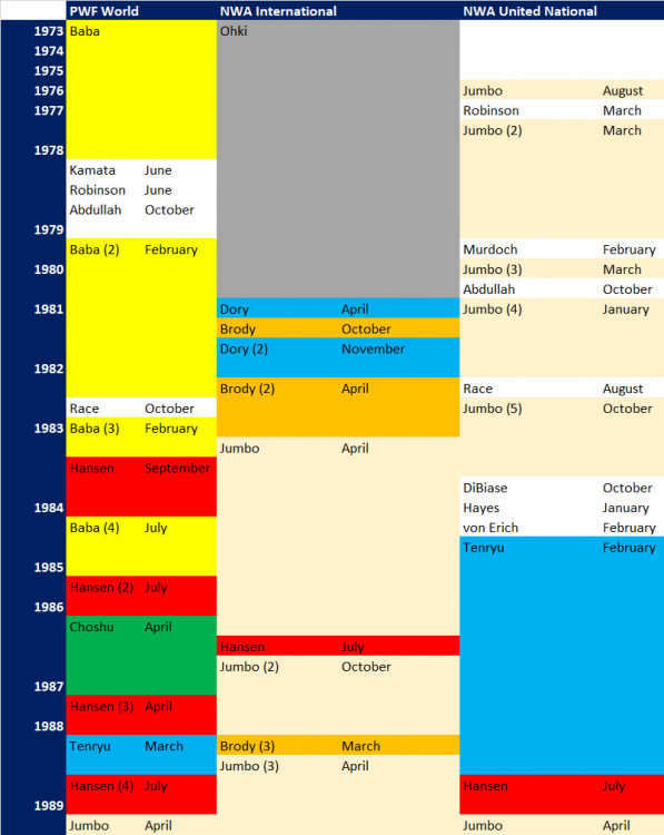 If you're anything like me, the AJPW single title scene prior to the Triple Crown is kind of a blur and I've been trying to get it clear in my head. Here's a little table I made to help see who held which title when at a glance. Now some notes: The International Title prior to 1981 wasn't actually in the company but was largely defended in South Korea by Ohki. This belt had tremendous prestige because it was the title for which Rikidōzan had defeated Lou Thesz in 1958. So the story goes, the NWA International Title was used by Thesz as an excuse to go skiing in Europe. He'd drop the NWA title before leaving, then defend the International title to pay for his vacation and then pick up the World title in a return match when he got back to the USA. When the NWA ordered Ohki to give the title back to AJPW, Dory won it in a tournament in which he faced Terry in the final (I believe this is their long 1981 match). From there, it gradually became the top title and by the time Jumbo won it in 1983 this was the number 1 belt. The PWF title was created after Baba won a series of 10 matches. It was the number 1 title for the 1970 and as you can see remained Baba's belt for most of the decade all the way until 1985. I am a little unclear about the status and prestige of the belt from 1985 to 1989 when it was chiefly held by Hansen with spells by Choshu and Tenryu. The UN title was very clearly the number 2 title, similar to the WWF IC belt or the US title in WCW. Jumbo just vacated the title in 1984 to focus on defending the International belt and DiBiase won it in a tournament defeating Tenryu in the final. The status of this title from 1985 onwards, during the period in which it was chiefly held by Tenryu is unclear to me. It's obviously the number 3 belt by this point, but was it a number 3 belt more like the TV title in JCP / WCW (i.e. a competitive and somewhat respected belt) or more like the European belt when it was established in WWF (i.e. a "nothing" belt)? Looking at the way cards were booked after 1985, Jumbo has relatively few title defences every year. In 1987, for example, he has almost exclusively tag matches for the whole year defending the belt only four times the whole year. Incidentally those title defences were: 4/2/87: Tommy Rich 4/24/87: Yatsu 7/22/87: Hansen 9/12/87: Bockwinkel This was massively reduced from the number of defences Dory had in 1981, where he seemed to treat it more like the NWA World title and took it to the USA for stints also. By 1985 we are down to just three defences in the year. PWF title meanwhile was defended 7 times in 1987. Choshu had one defence against Curt Hennig before leaving for New Japan, then Hansen won a tournament defeating Wajima in the final. Defences against: Yatsu, Tenryu, Wajima. Incidentally, Baba did not defend this belt much in certain years. For example in 1980 and 1984 he defended it only 3 times. There does not seem to be more than 7 title defences in any given year. The UN title, incidentally, was defended only twice by Tenryu that year vs. Hansen and Yatsu. This is massively down from the 8-10 times a year Jumbo would defend this belt against all comers in the early 1980s. By 1985, Tenryu is already down to just the 2-3 defences a year. So each of the belts that formed the triple crown were not defended that regularly. AJPW focused heavily on tag wrestling and tournaments, so the title matches are few and far between. Still interesting to think about the relative prestige of the titles at any particular time.