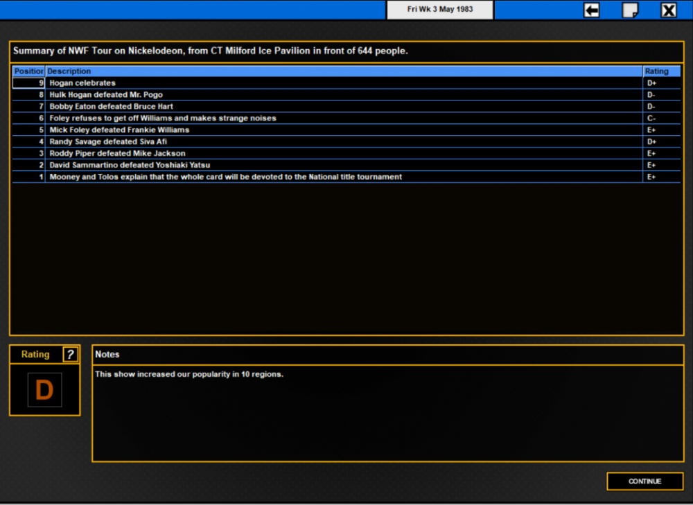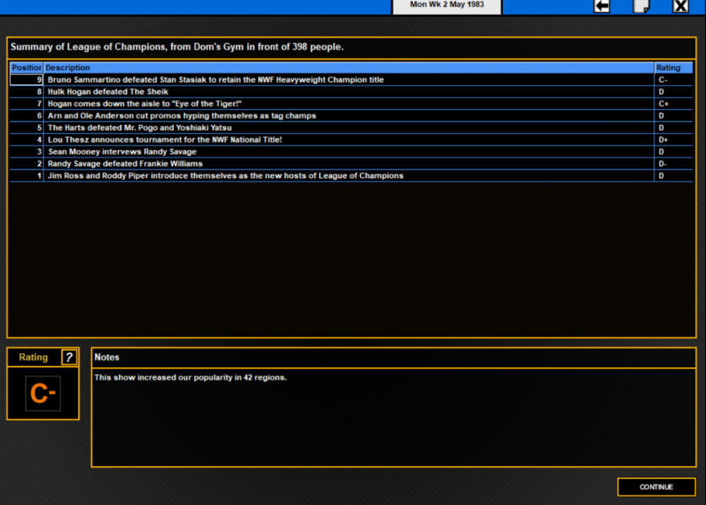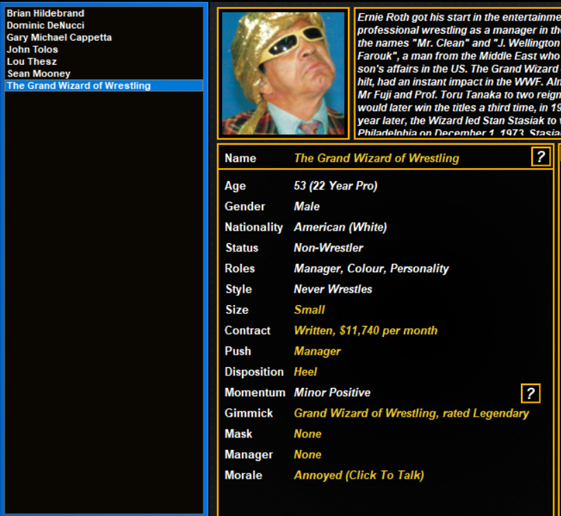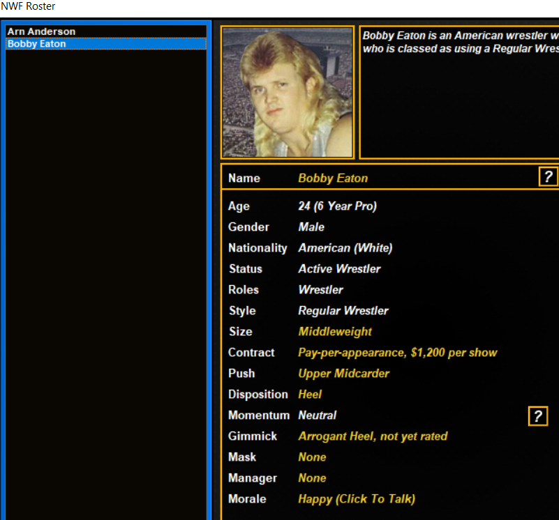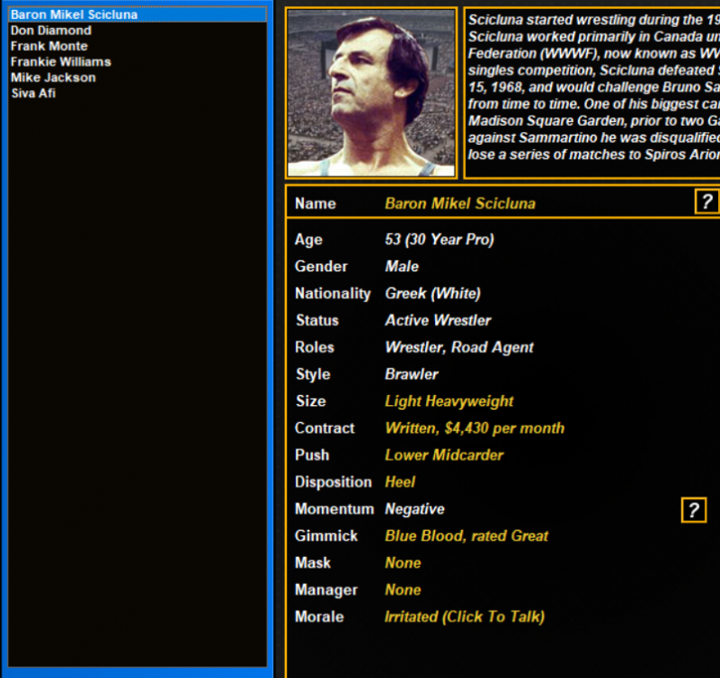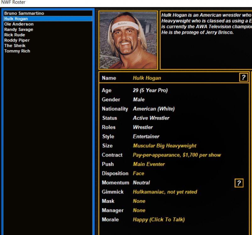 Mohammed Saed has just handed in his notice, and Don Leo Jonathan -- who seems to have a lot of heat in the locker room as a road agent -- has also requested to leave which has been agreed, both are gone from NWF. Coming in the other way is Bobby Eaton and David Sammartino back from rehab. This seems a good time to take stock of the roster. Let's look at the out-of-ring talent: The Mooney / Tolos partnership is still quite a sub-par pairing for TV and I am considering transitioning Mooney into an interviewer role and bringing in a new play-by-play guy to pair with Roddy Piper on the A show with Tolos on the B show. An offer has been made to try to lure Jim Ross away from Mid-South. With Don Leo Jonathan leaving, Lou Thesz continues as the main road agent, as well as on-air President of NWF, and Dominic Denucci is an agent also. Brian Hildebrand is the only ref and Grand Wizard the only manager. As things stand more are not required. Let's look at the job squad now. Scicluna is still in rehab and it strikes me that there are no heel jobbers on the roster. Offers have been made to Lanny Poffo, which should make Savage happy if he comes, Paul Christy, Terry Gibbs, and Victor Rivera. Next up, the midcard. Most of these guys are currently in the tag mix with the exception of Foley and Douglas who are long-term projects. Foley is still only 17 and Douglas is 18. I want to keep them bubbling away on the undercard for a good while -- with Foley working the angle of being strange or mentally deranged. There are two wrestlers who a notch above these workers: Arn is still quite young here but is already tag champion with Ole, and I am not yet sure what to do with Eaton. The roster may be getting big enough to introduce a secondary singles title. Finally the stars: The promotion has been ticking over and steadily growing in its first five months with Bruno working various one-shot challengers brought in by the Grand Wizard in the Vince Sr pattern. But Bruno is 47 years old and this will not be good long-term. In the short-term this can continue ticking over, but new stars need to be built. Tommy Rich and Hulk Hogan are both already popular regional stars with national recognition. Savage is less well known and Rude still virtually unknown. Piper is a pretty big star, especially in the Mid-Atlantic and South West regions, as well as in the North West. The challenge will be to create some hot feuds involving these guys to build them to a point where any could be viable contenders for Bruno's title. The establishment of a secondary heel champion with babyfaces chasing him might help here. Looking at the options, Rude is not yet ready for this role, so it will be between Savage and Piper. I have yet to use Piper in the ring at all, he is presenting Piper's Pit on the B show currently -- this may well get switched to the A show. That leaves Savage as the secondary champion. And I think a tournament is the obvious way to do this. Perhaps Piper could form an alliance with Savage and The Andersons with a stated mission to take over the world of NWF as the true "Masters of the League of Champions". Yes, a stable! Perhaps this is where Bobby Eaton comes in as a member of this group. The stable can be called "The Five Star" -- not only a nod to the dirt sheets but also the idea that the five men form five points of a star. The story will then be of Hogan and Rich both turning up to stop this group taking over and allying with the Harts. Then we have: Hogan vs. Piper as the headline feud. Rich chasing Savage for the secondary belt. Harts chasing Andersons for the tag titles. Bobby Eaton in the role of being the first obstacle to face or slotting in as tag partner where necessary. All the while that goes on Bruno will continue to face villains of the month managed by Grand Wizard and defending his title almost detached from the rest of the card. Have just tried to sign Miss Elizabeth also, who will add some flavour to the whole deal.