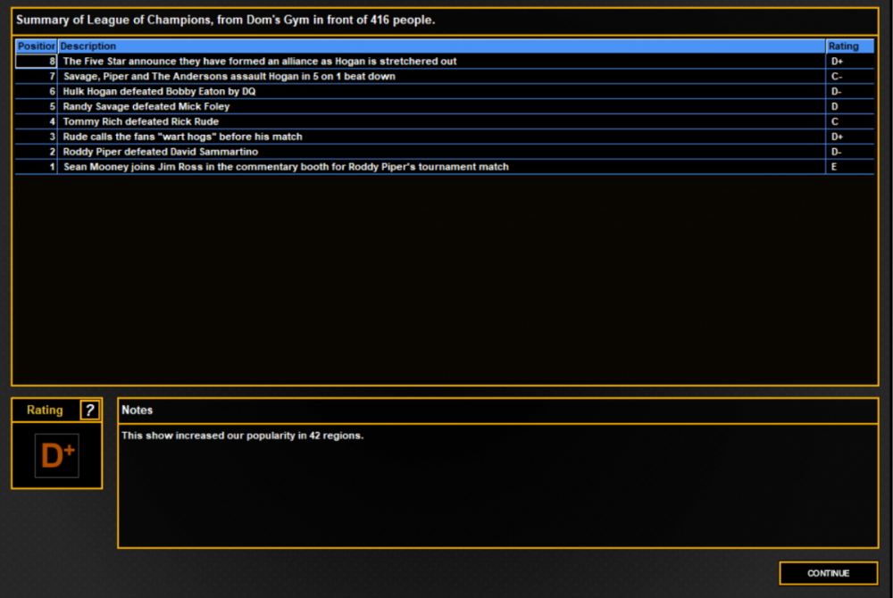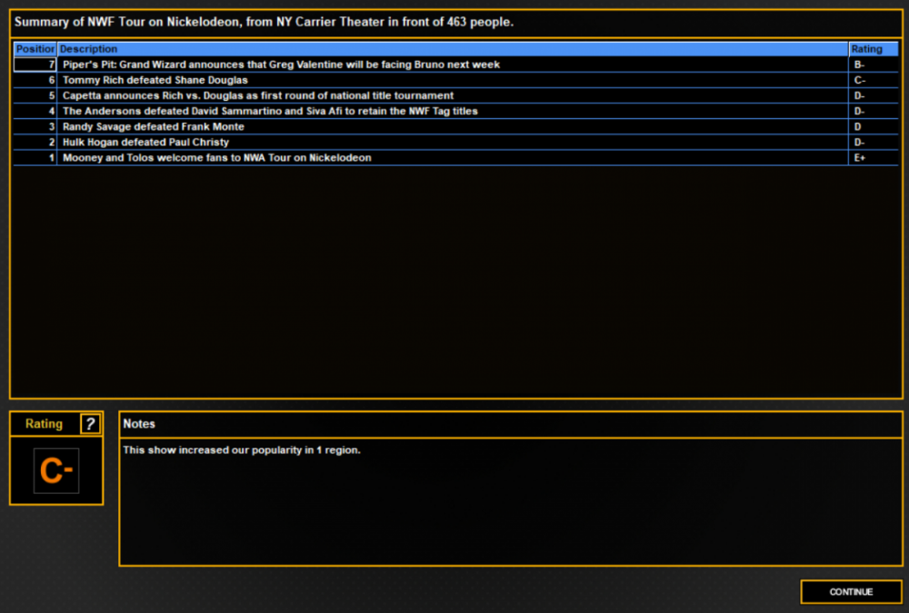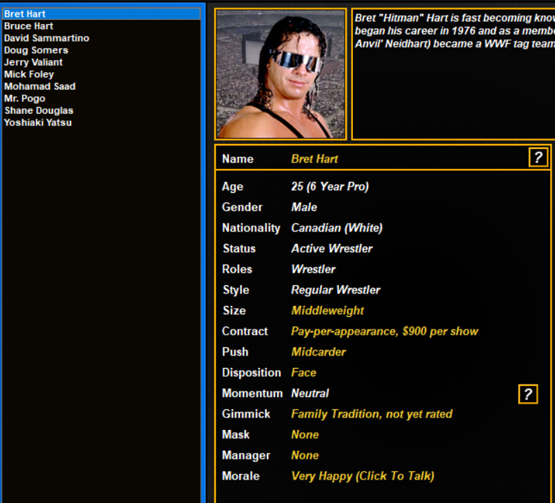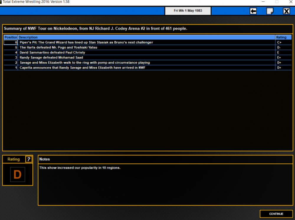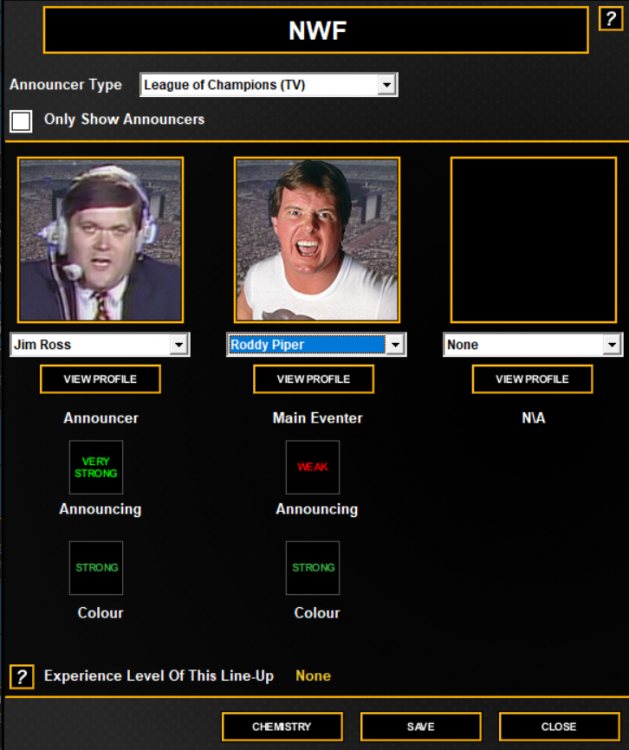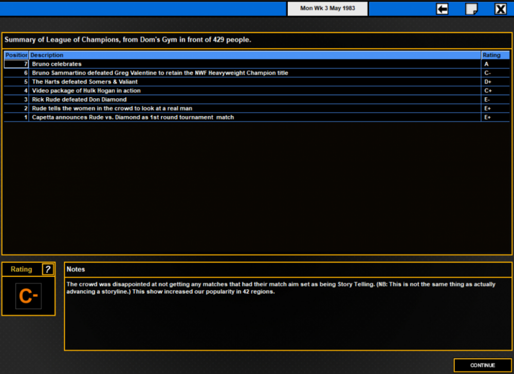 Mohammed Saed has just handed in his notice, and Don Leo Jonathan -- who seems to have a lot of heat in the locker room as a road agent -- has also requested to leave which has been agreed, both are gone from NWF. Coming in the other way is Bobby Eaton and David Sammartino back from rehab. This seems a good time to take stock of the roster. Let's look at the out-of-ring talent: The Mooney / Tolos partnership is still quite a sub-par pairing for TV and I am considering transitioning Mooney into an interviewer role and bringing in a new play-by-play guy to pair with Roddy Piper on the A show with Tolos on the B show. An offer has been made to try to lure Jim Ross away from Mid-South. With Don Leo Jonathan leaving, Lou Thesz continues as the main road agent, as well as on-air President of NWF, and Dominic Denucci is an agent also. Brian Hildebrand is the only ref and Grand Wizard the only manager. As things stand more are not required. Let's look at the job squad now. Scicluna is still in rehab and it strikes me that there are no heel jobbers on the roster. Offers have been made to Lanny Poffo, which should make Savage happy if he comes, Paul Christy, Terry Gibbs, and Victor Rivera. Next up, the midcard. Most of these guys are currently in the tag mix with the exception of Foley and Douglas who are long-term projects. Foley is still only 17 and Douglas is 18. I want to keep them bubbling away on the undercard for a good while -- with Foley working the angle of being strange or mentally deranged. There are two wrestlers who a notch above these workers: Arn is still quite young here but is already tag champion with Ole, and I am not yet sure what to do with Eaton. The roster may be getting big enough to introduce a secondary singles title. Finally the stars: The promotion has been ticking over and steadily growing in its first five months with Bruno working various one-shot challengers brought in by the Grand Wizard in the Vince Sr pattern. But Bruno is 47 years old and this will not be good long-term. In the short-term this can continue ticking over, but new stars need to be built. Tommy Rich and Hulk Hogan are both already popular regional stars with national recognition. Savage is less well known and Rude still virtually unknown. Piper is a pretty big star, especially in the Mid-Atlantic and South West regions, as well as in the North West. The challenge will be to create some hot feuds involving these guys to build them to a point where any could be viable contenders for Bruno's title. The establishment of a secondary heel champion with babyfaces chasing him might help here. Looking at the options, Rude is not yet ready for this role, so it will be between Savage and Piper. I have yet to use Piper in the ring at all, he is presenting Piper's Pit on the B show currently -- this may well get switched to the A show. That leaves Savage as the secondary champion. And I think a tournament is the obvious way to do this. Perhaps Piper could form an alliance with Savage and The Andersons with a stated mission to take over the world of NWF as the true "Masters of the League of Champions". Yes, a stable! Perhaps this is where Bobby Eaton comes in as a member of this group. The stable can be called "The Five Star" -- not only a nod to the dirt sheets but also the idea that the five men form five points of a star. The story will then be of Hogan and Rich both turning up to stop this group taking over and allying with the Harts. Then we have: Hogan vs. Piper as the headline feud. Rich chasing Savage for the secondary belt. Harts chasing Andersons for the tag titles. Bobby Eaton in the role of being the first obstacle to face or slotting in as tag partner where necessary. All the while that goes on Bruno will continue to face villains of the month managed by Grand Wizard and defending his title almost detached from the rest of the card. Have just tried to sign Miss Elizabeth also, who will add some flavour to the whole deal.