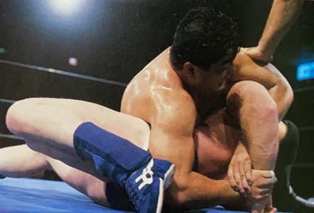 Karelin attempts to muscle David to the mat on his stomach, but the Georgian resists and grabs one of Karelin’s legs. Despite Karelin’s strength so far, David gets his opponent off balance and scores a single-leg takedown as Karelin lands on his stomach. David scores a single point from this move and the match is now 1-0 in favor of the Georgian. Kitazawa resets the match as the two Soviet gold medalists face off in the center of the ring again. David tries to keep a lower profile this time and keeps low to try and beat Karelin’s preferred upper-body approach while shooting for his legs, where he isn’t used to defending. Karelin does well to pull back just in time to avoid another takedown and gets David on his knees as muscles his opponent down and takes control of his back. With David’s back exposed, Karelin grabs his waist and rolls him over on the canvas. Karelin gets a point for this maneuver and the match is now tied at 1-1. With another reset, the two are positioned back in the center of the ring and resume the contest. David immediately shoots for Karelin’s legs again and wraps both legs with his arms, Karelin does well to remain standing, using his lower-body strength to keep his footing while grappling David from the waist. The Georgian finally trips up Karelin as he uses his strength to lift his opponent, and Karelin is seated on the canvas while David ties up both of his legs. David attempts to retain control of these limbs while trying to force Karelin on his back, but Karelin, of course, is too strong and both have somewhat of a free-flowing grappling exchange on the canvas with both showing off their refined wrestling abilities. They both end up getting a point each as they exchange positioning on their stomachs. After the exchange, there is a reset and it is now 2-2 apiece.