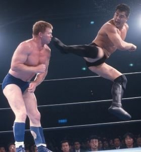 UWF’s fans in Osaka-jō Hall get their first glimpse of the influx of Soviet talent as Andrei Kopylov makes his way to the ring wearing black knee-length tights. Nobuyuki Furuta announces him in the ring as a “Soviet heavyweight SAMBO champion” and the crowd gives a firm round of applause for the mysterious newcomer. Fujiwara, of course, comes out to a much louder reception as he looks to defeat a potentially dangerous opponent to close the year and cement his place in UWF as a top guy with Sayama, Maeda, and Takada. The bell sounds and the fans immediately get a taste of Kopylov’s unique style as he immediately begins to look for unique leg lock entries, forcing Fujiwara to utilize his expert defense to keep the Russian at bay. Fujiwara manages to ground the bold Kopylov and tentatively engages in a brief grappling exchange with his opponent, but Kopylov nearly snatches Fujiwara into a triangle choke and Fujiwara quickly chooses to back off as Kopylov stands up with the crowd murmuring at Kopylov’s display so far. Kopylov demonstrates his striking ability with several hard kicks and well-timed open-hand strikes, but Fujiwara fires back and gives Kopylov a stiff slap across the face as a welcome to the UWF. The crowd swells as Fujiwara gives a slight smirk on his face.