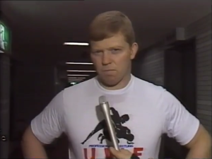 The WOWOW broadcast goes live and starts with Bob Backlund giving a taped interview on camera. Backlund says that he was attracted to UWF because of the scientific style, which he enjoys. “It’s science, it’s knowledge, it’s conditioning and it is what I want to be involved in,” Backlund says that UWF is what wrestling should be all about. Next, the UWF theme plays over clips of previous matches over the past six months, recapping all the action. Then we get Tekken-esque title cards as each match for tonight’s card is announced by the voice of Ward Sexton (of Resident Evil and RINGS fame). The WOWOW commentary crew welcomes the viewing audience to the show and they hype up the historic evening. They highlight the main event, Akira Maeda facing off against Volk Han, the debut of Victor Zangiev and Salman Hashimikov against the Koslowski brothers, and the clash between Olympic gold medalists Aleksandr Karelin and David Gobejishvili. They also discuss the Brazilian Vale Tudo exhibition between Marco Ruas and Casemiro “Rei Zulu” Martins.