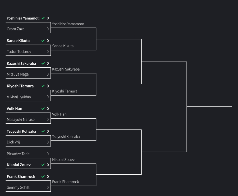 The Georgian grappler with a background in both amateur wrestling and SAMBO presents a tough challenge for Yamamoto, but the RINGS dojo product comes firings back around the 12:00 mark after being down 5-3 on points to score a knockdown on Zaza. Yamamoto manages to grapple with Zaza and secures a victory after locking in his opponent with a triangle armbar Zaza taps and the fans celebrate as Yamamoto advances! Yamamoto defeats Zaza via submission (triangle armbar), 12:42