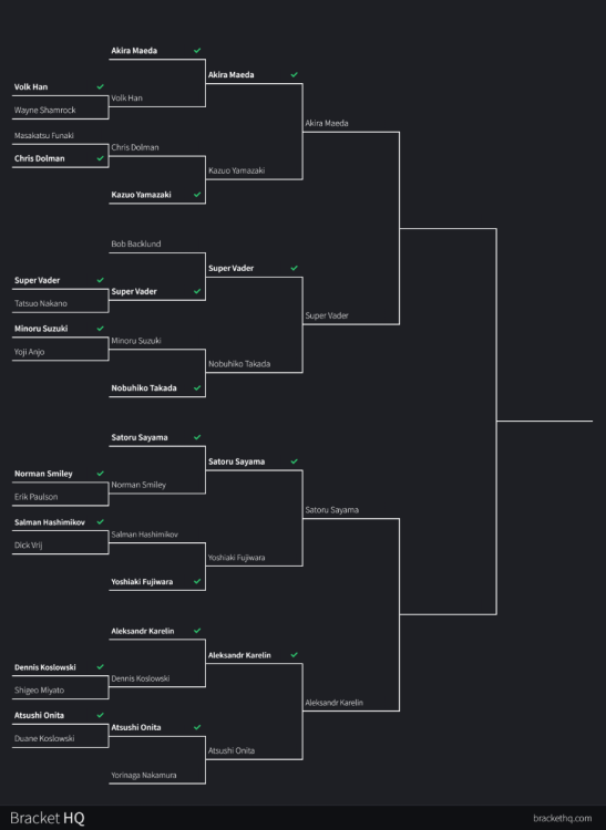 Huge cheers for the usual suspects, with Maeda and Sayama getting the loudest. Karelin, Vader, Suzuki, Funaki, Han, and a few others get a good amount as well. After the parade is wrapped up, cameras switch to Karl Gotch, Billy Robinson, Lou Thesz, Tatsumi Fujinami, and George Foreman all sitting ringside. Maeda and Sayama give speeches thanking the fans for coming and promising a great event. Sayama says he is focused and ready to win the tournament while Maeda says he has a tough ask on hand but is confident in succeeding. Takada is introduced as well. Takada says he won't be competing tonight due to a minor injury, but says he is looking forward to competing next month. He wishes the fans a happy new year. After the commentators talk over a brief break, the event is officially underway.