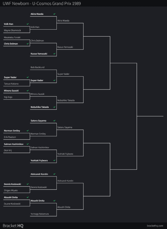 Card Announcement: UWF Newborn - "U-COSMOS Grand Prix 1989: First Round" September 27th, 1989 Tokyo NK Hall Chiba, Japan First Round Matches: Minoru Suzuki vs Yoji Anjo Norman Smiley vs Erik Paulson Dennis Koslowski vs Shigeo Miyato Volk Han vs Wayne Shamrock Masakatsu Funaki vs Chris Dolman Super Vader vs Tatsuo Nakano Salman Hashimikov vs Dick Vrij Atsushi Onita vs Duane Koslowski Special Tag: Akira Maeda & Joe Malenko vs Nobuhiko Takada & Chris Benoit- UWF Newborn