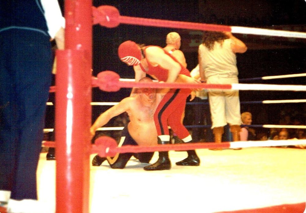 By the early 90s Roach had replaced Daddy as the man Stax was scared of and they had quite a feud both on Reslo reissued in Wrestling Madness and for Ring Wrestling Stars (the former Joint) on their 1992 Battle Of The Brits video release partnered for the Reslo match by Drew McDonald and a long haired Robbie Brookside (this match gets reviewed later on) and for the videotape by Scrubber Daly and Alan Kilby. They also had a back and forth feud for the European Heavyeight title. Roach was due to referee the 1991 Kendo vs Haystacks "CWA" (don't tell Luc Rambo Poirier) World title match in Croydon in late '91 as featured in BBC2's Masters Of The Canvas Arena docu, but Kendo's manager Lloyd Ryan objected so Steve Grey was brought in as replacement. Stax had no objections despite his own feud with Roach. Ah yes, the famous WrestleMania IV Battle Royal Rip Off Finish: Unlike Bret Hart, Rasputin's turn to good only lasted the one match before he was back teaming with Anaconda to face Daddy and Pat Patton in the match Tommy "Jack Dempsey" Moore and Ernie Riley had a good sneer at over wine in First Tuesday The Wigan Hold. There were actually a series of two matches within a short period of this. Max Crabtree off the back of the Kendo series was trying to promote Daddy as the kids hero in the Best Wryton area (Midlands + Lancs) but other promoters were having none of it and put Daddy on again as a heel. First he squashed the much lighter Jamaica Kid in Feb '76 then in March he got himself DQ's against Steve Veidor in singles wrestling after one pinfall each (I would love to see Viedor'spin on Daddy!) and now these two bouts. That seems to have been the end of Daddy the heel although he and Stax continued to do bouts like this into early '77 mostly for Morell and Beresford (rest of North) The sandwich double bodycheck was Daddy and Stax's speciality, although it was an illegal double team and such things were clamped down on pretty firmly over here.