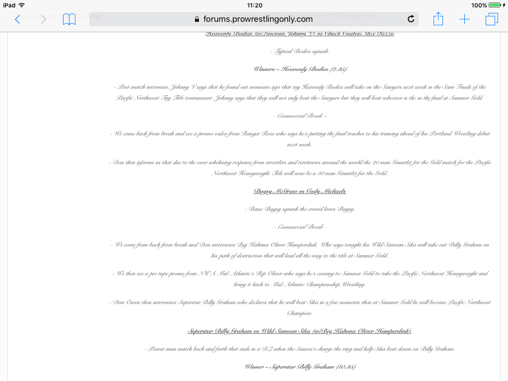 - Post match interview, Johnny V says that he found out moments ago that my Heavenly Bodies will take on the Sawyers next week in the Semi Finals of the Pacific Northwest Tag Title tournament. Johnny says that they will not only beat the Sawyers but they will beat whoever is the in the final at Summer Gold.